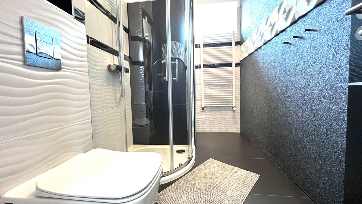 - Felszereltség: zuhanykabin, mosógép, hajszárító